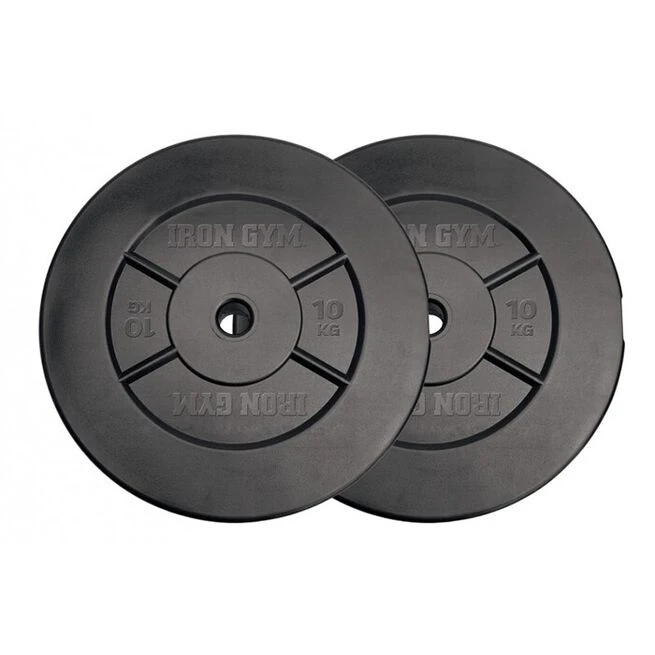 Iron Gym 20kg Plate Set består af to slidstærke vægte på 10 kg hver. Vægtene passer til Iron Gyms forskellige skive- og vægtstænger.